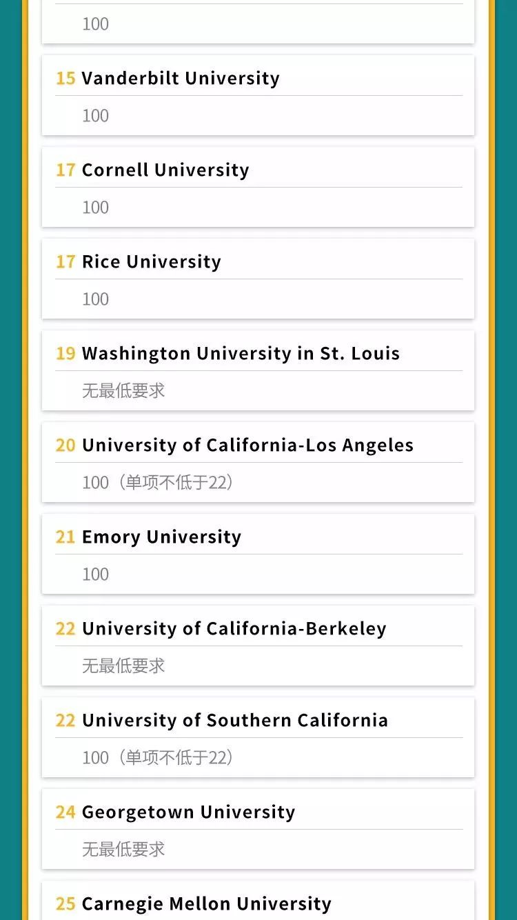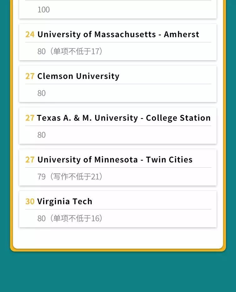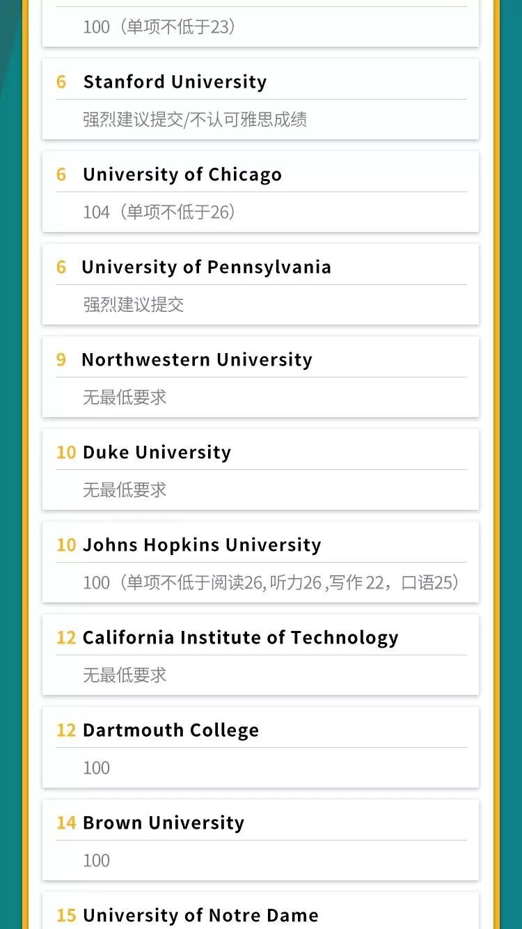 值得注意的是,上述排名中给出的数据,和早些时候小站君整理发布的2020年美国大学排名榜单并不完全一致,比如综合排名并列第三的麻省理工之前有一条托福最低分数90分的要求就没有在这个新榜单中体现出来;另外在上述榜单中特别强调的斯坦福大学“不认可雅思成绩”也颇为耐人寻味。