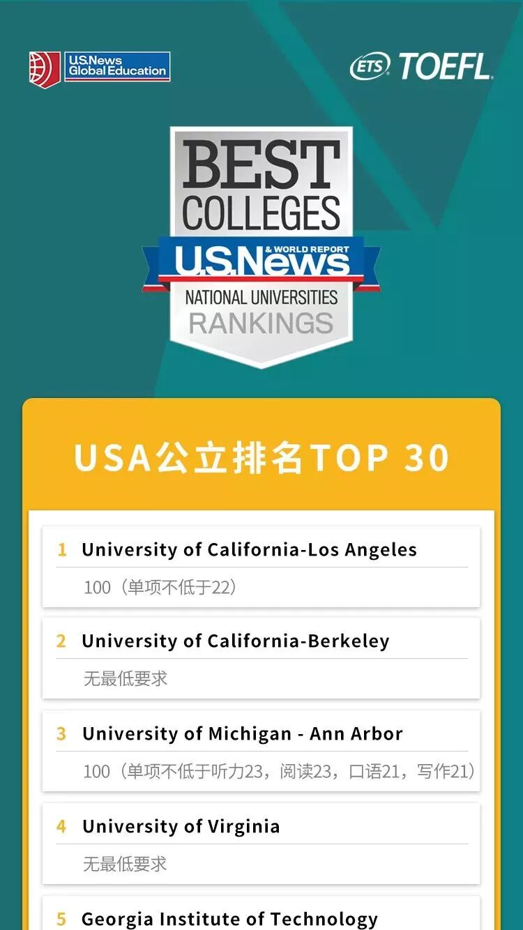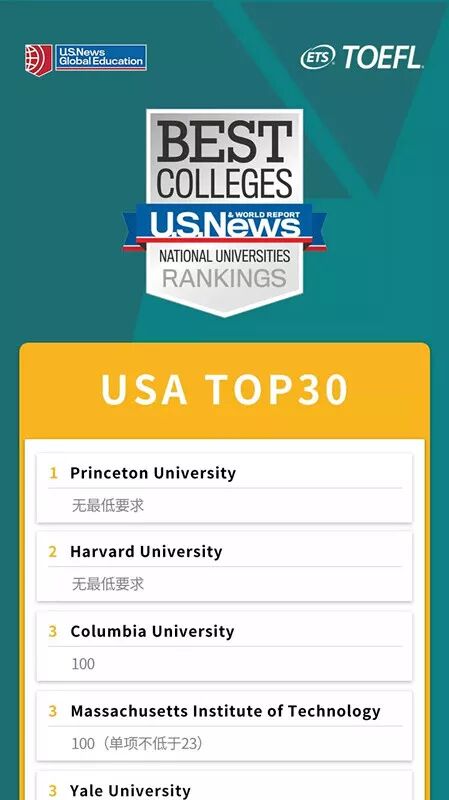 近日,托福考试官方和U.S.News联合发布了2020年美国TOP30大学的托福成绩要求,其中包括了美国综合大学排名前30和公立大学排名前30这两个榜单的成绩数据,下面就来看一看这些顶级的美国名校,对于托福分数到底有怎样的要求吧!
