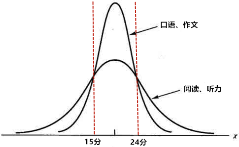 当然上述的理论稍微有点抽象,高的那条曲线是口语和作文,低的那条曲线是阅读和听力。在15~24分之间,口语和作文那条曲线比较高,因此占了绝大多数人。而阅读和听力在15-24分之间,那条曲线比较低,因此阅读和听力在15 ~ 24分之间的人只占了40%,还是有很多人在15分以下,以及24分之上的。