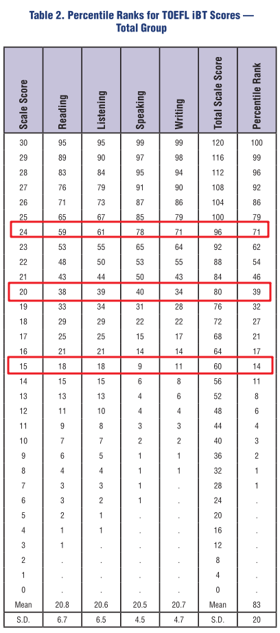换句话说,也就是你阅读、听力、口语、作文各个单项达到了24分,阅读听力在全球只能排进前40%,但是口语和作文你已经排进了全球的前25%,从这个数据我们可以非常清晰的看出来,口语和作文想达到24分以上,难度到底有多大!这是真正的拉分项,就是在最后决战的时候是要靠这里拿分的!